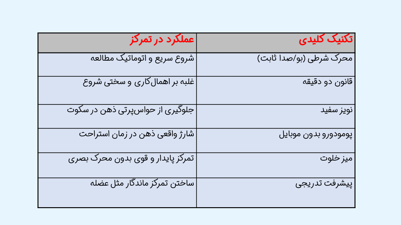 روش اجرا: اگر امروز فقط ۱۰ دقیقه میتوانید باکیفیت تمرکز کنید، هدف فردا را ۱۵ دقیقه قرار دهید. هفته بعد، ۲۰ دقیقه.
